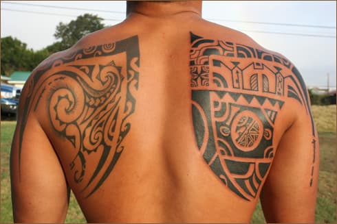 Wording and cross tattoo on back.